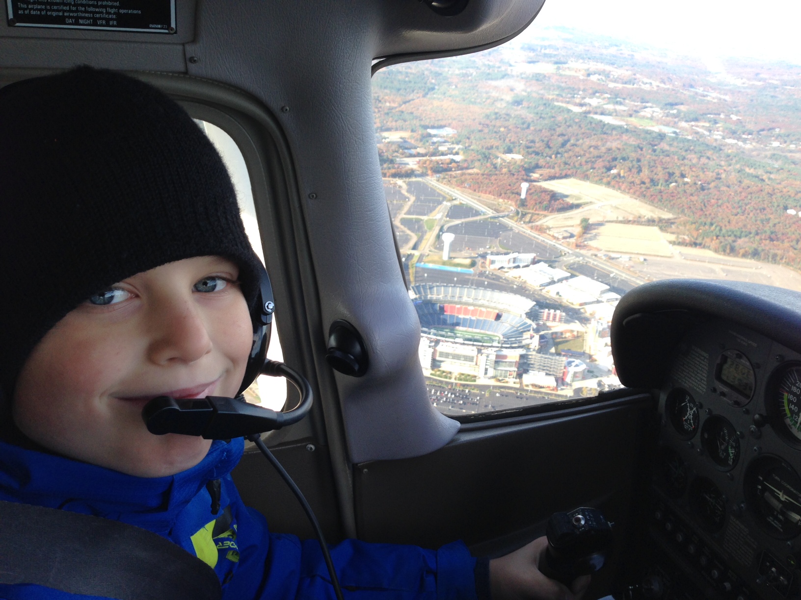 The 10 year old, steady-on-the-controls (student) pilot performed marvelously throughout the flight. I was admittedly surprised at how well he did. I expected him to have a touch of “video-gamer” control handling. This is when a pilot over actively makes control inputs as if using a video game controller instead of an aircraft yoke. Not only does it result in flight instructors having to do a lot of work as a safety buffer but it also makes for a choppy ride on even the smoothest day. However, during the early fall morning flight with Eric, there was none of that. Eric’s father, our first class passenger for the day, had a nice smooth ride and was able to enjoy Eric’s flying, my teaching and a great bird’s-eye-view the home of the New England Patriots, Gillette Stadium!