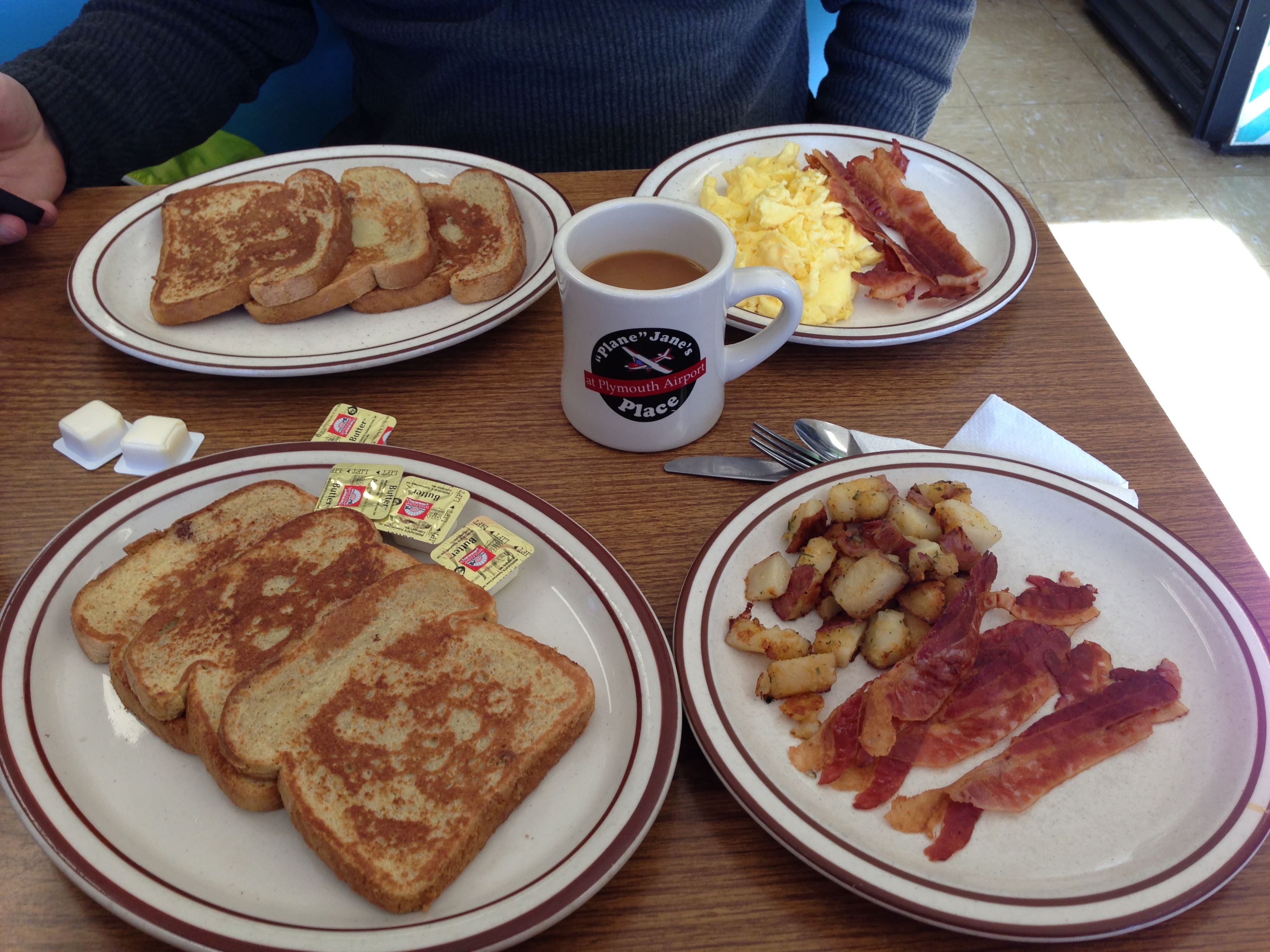 The weather briefer confirmed my thoughts saying the forecast was for winds from the southwest to pick up as the day progressed, making for a lively crosswind at Mansfield later that afternoon. As such, we decided the restaurant to visit for a blog review would be Plane Jane’s Place at the Plymouth, MA airport. It would literally be a “quick hop,” before our breakfast.
