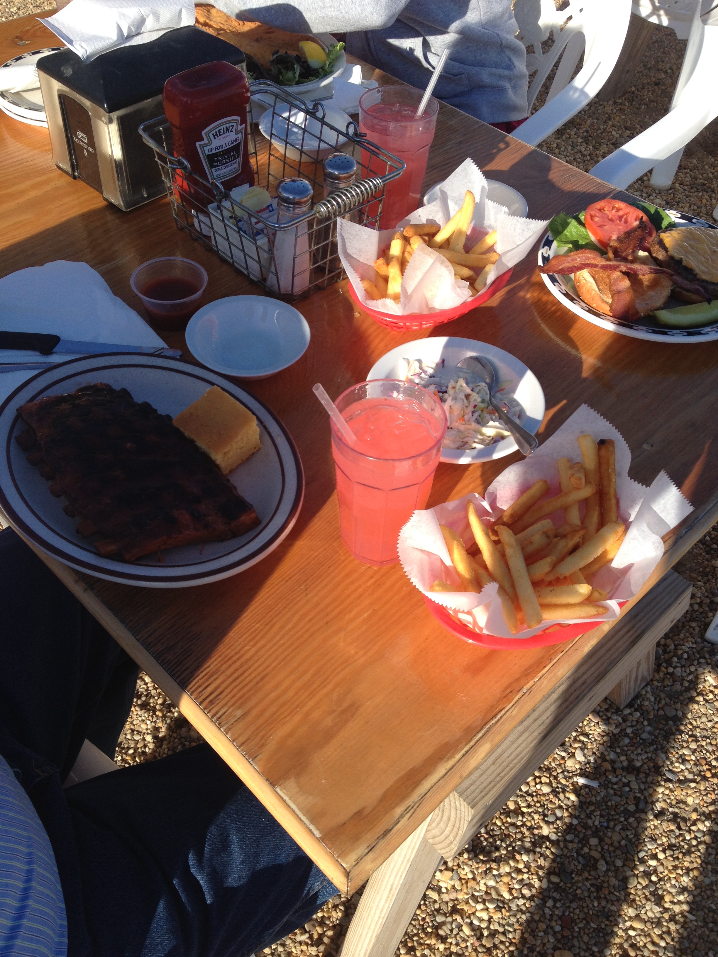 We were served waters to start, and as hungry as we were, our orders were put in quickly. I decided on a Bacon Cheeseburger with Fries. Tom was craving ribs and cornbread before we even took off out of Mansfield and Audra ordered fried flounder and a baked potato. None of us had ever had flounder before, so it was a “cross your fingers its good” type of meal. You really can’t go to Crabby Cowboys with a group and not have the Crabby and Cowboy portion of the menu! As we waited for our meals, we were lucky enough to have some aircraft traffic taking off Runway 6 right over our heads. Aviation enthusiasts like ourselves can never get enough airplanes, no matter where we go!