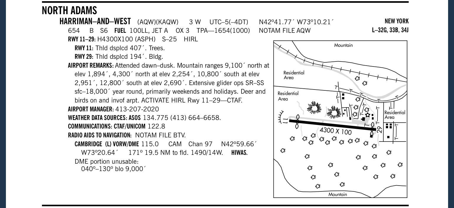 After battling the jolting turbulence through the beginning of the Berkshires, I finally arrived within the vicinity of my destination. Winds were out of the west at the field, almost straight down the airport’s only paved strip 11-29. AQW is mounted in the Hoosic River Valley between a shallow sloped mountain, Eastern Mountain -to it’s North; and to it’s South, the largest mountain in the state of Massachusetts, Mt. Greylock -sitting at 3,491 feet. Upon arriving within the vicinity of AQW, I was greeted by several voices over the CTAF. I thought this was highly unusual considering the remote area I was flying to, and my (perceived) unpopularity of the airport. I began my entrance to the area via the Eastern portion of the Hoosic River Valley, when I quickly began to realize, this was not going to be easy. To my dismay, I had left out a very important task in flying to an unfamiliar airport during my pre-flight planning, and that is to check to see how to enter the airport’s traffic pattern! I assumed, that upon arrival at this airport, I would simply enter it’s traffic pattern, then breezily make my way into a picture perfect downwind and final approach. Well, reality gave me an excellent wake up call that day, and completely changed the way I confront my pre-flight planning. (Especially to mountainous areas)
