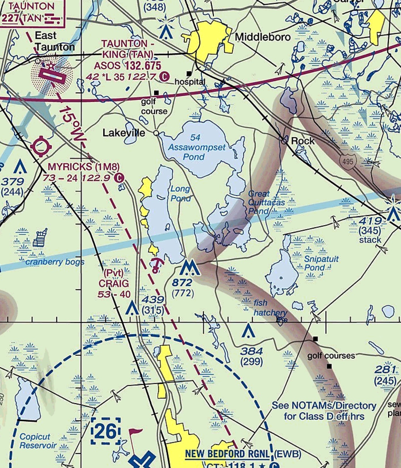 This look at the “Practice Area” just north of my home airport shows the detail with which bodies of water are diagramed for use as checkpoints. Also note the elevation of Assawompset Pond is shown for those of us that fly around with floats under our wings…